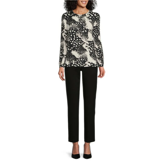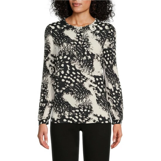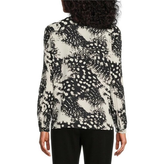 Flash Sale ❤️ Investments Dynamic Animal Print Pleated Long Sleeve Jewel Neck Covered Half Button Placket Woven Top ✨