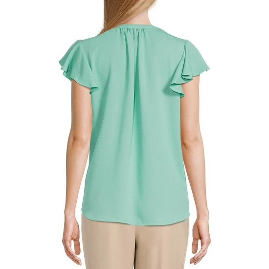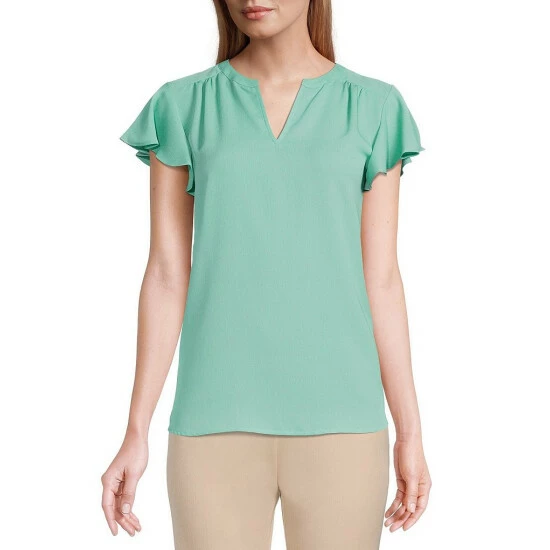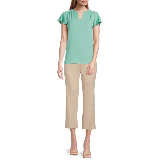 New 👍 Investments Petite Size Split V-Neck Short Flutter Sleeve Top Dusty Jade Green 🔔