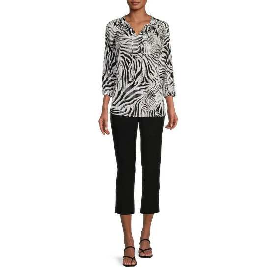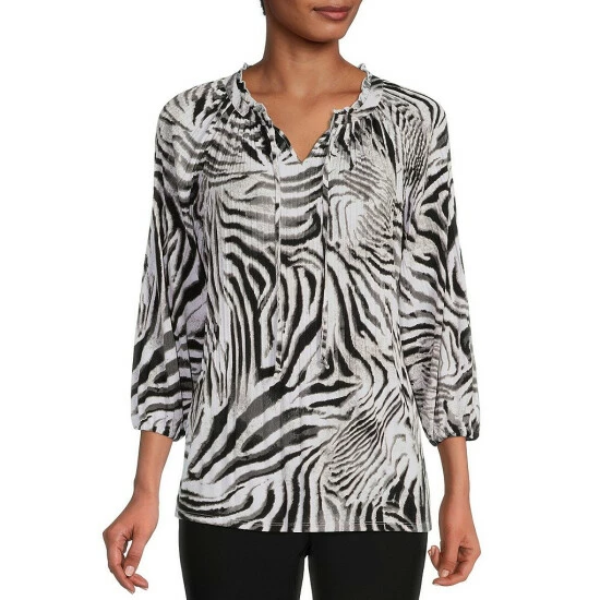 Deals ⭐ Investments Petite Size Zebra Knit Pleated Tie Split V-Neck 3/4 Sleeve Top Neutral Zebra ⌛