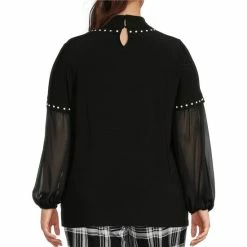 Best Sale ⌛ Slim Factor By Investments 3/4 Ruffle Sleeve Rhinestone Button Front Blouse Black 🔔