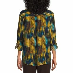 Hot Sale 👍 Investments Petite Size Olivia Blurred Ikat Point Collar Long Roll-Tab Sleeve Button Front Utility Blouse 👏