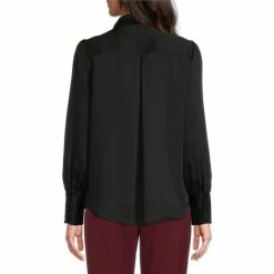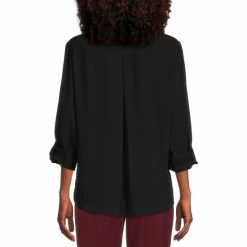 Discount 💯 Investments Petite Size Woven Long Sleeve Button Front Notch Collar Top Black ❤️